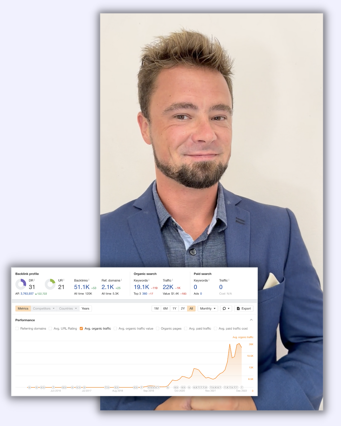 A 144% growth in total organic keyword rankings, a 47% increase in organic sessions, and organic revenue up 101% (year on year).