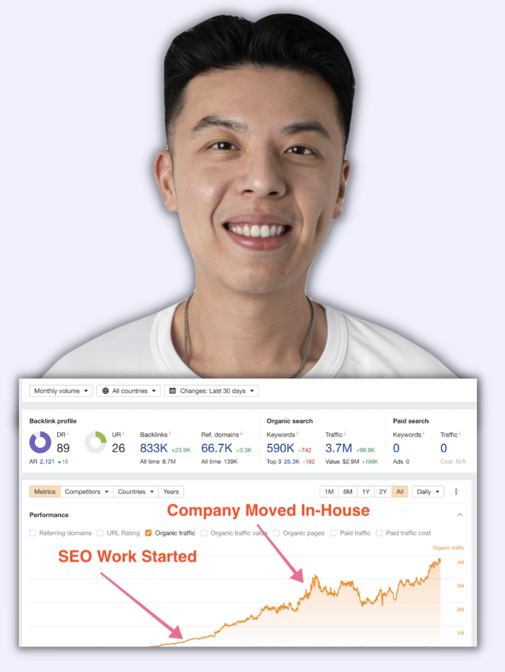 High rankings in high traffic “entrepreneurial” keywords, which resulted in 10k+ signups and $10m+ ARR.